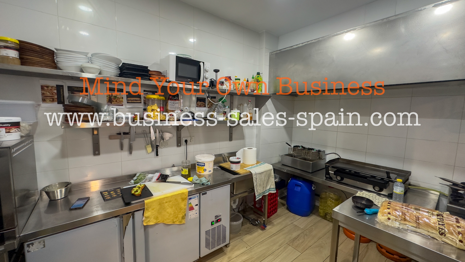 The kitchen is fitted with stainless steel appliances including preparation areas, fridges, twin fryer, plancha (griddle) oven, microwave, sink dishwasher and extraction system.