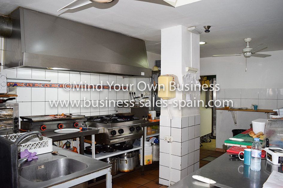 The open kitchen has a large extractor, 4 burner hob, 2 ovens, deep fat fryer, plancha (grill) fridge, bainmarie and preparation area with granite surface and sink.