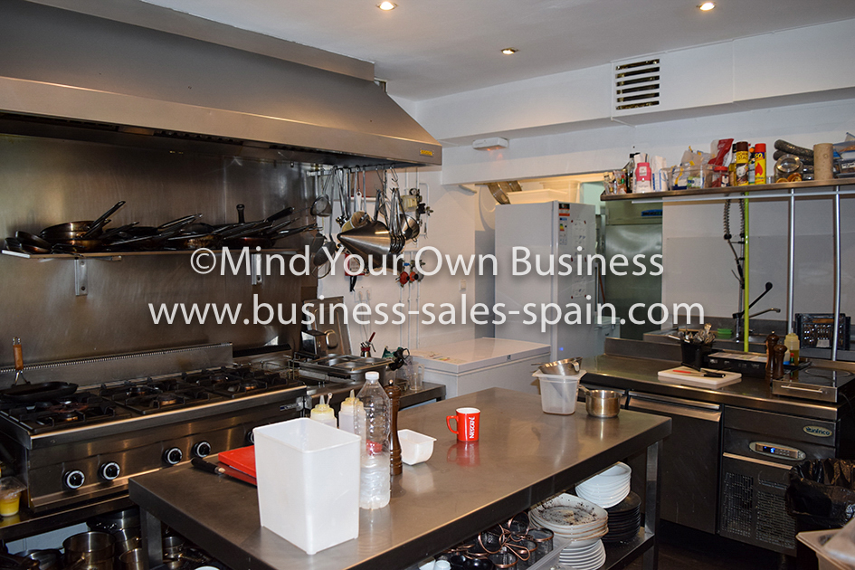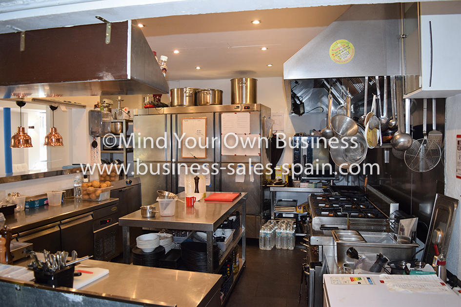 The kitchen is extremely impressive and comes completely equipped. It has stainless steel appliances and preparation areas, there is a large extractor, 6 burner hob, a plancha, deep fat fryer, fridges, freezers,. There is a separate wash area with sink and dishwasher. There is also a warm expediting line in front of the window seen from the dining area.