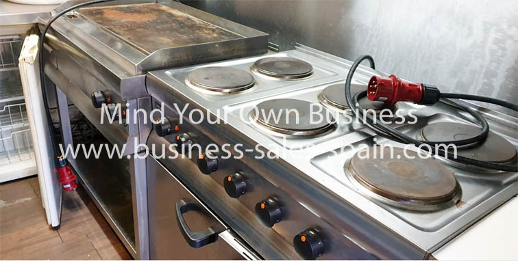 The kitchen is fitted with stainless steel equipment including 6 burner hob, oven, plancha, full extraction system, fridges, freezers, dishwasher and sink.