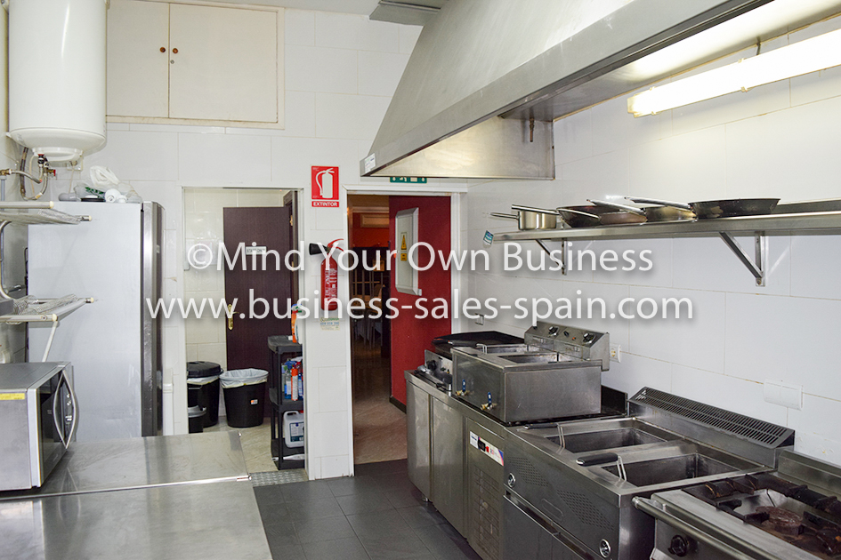 h is fitted with stainless steel appliances including, 3 burner range cooker, 2 twin deep fat fryuers, plancha, microwave oven, preparation area, shelving and large extractor.