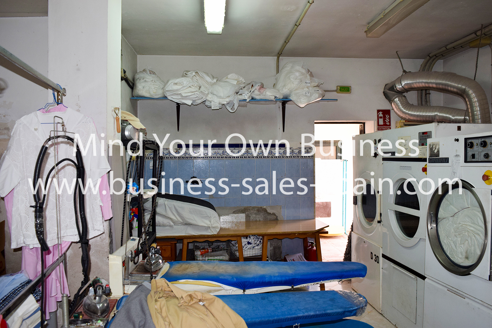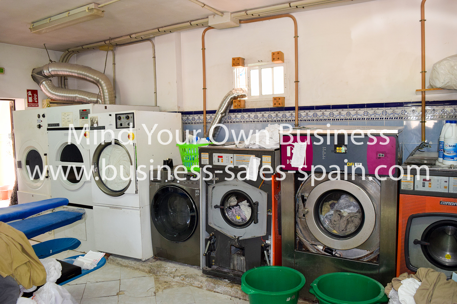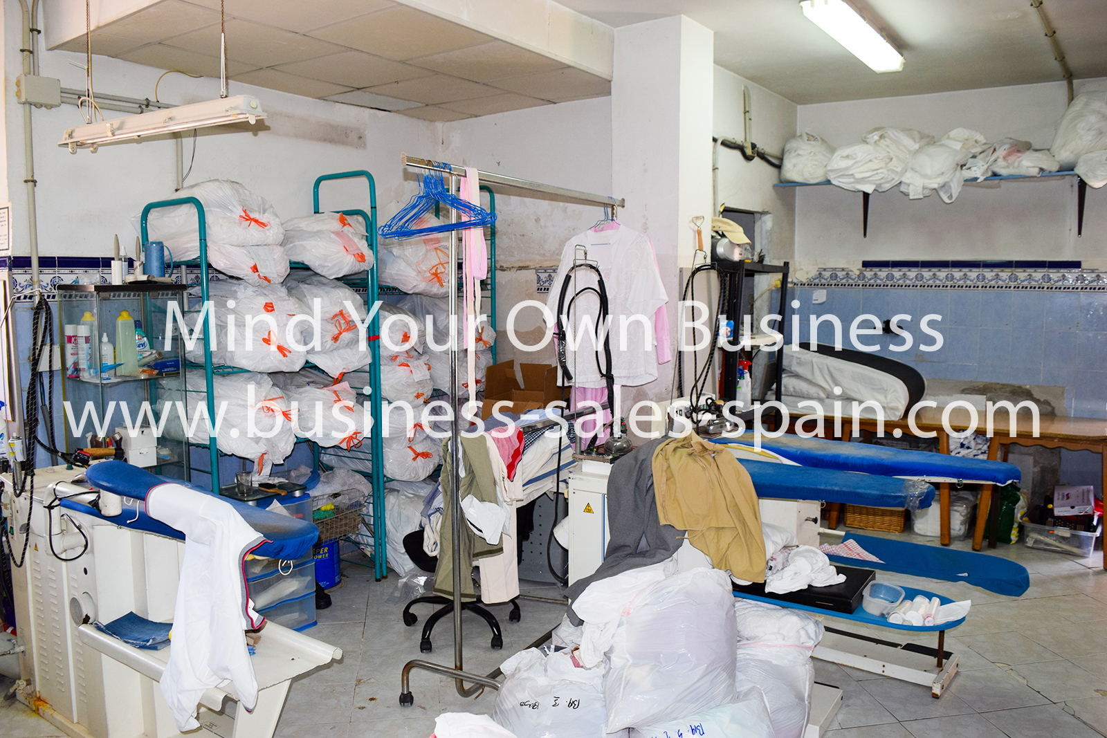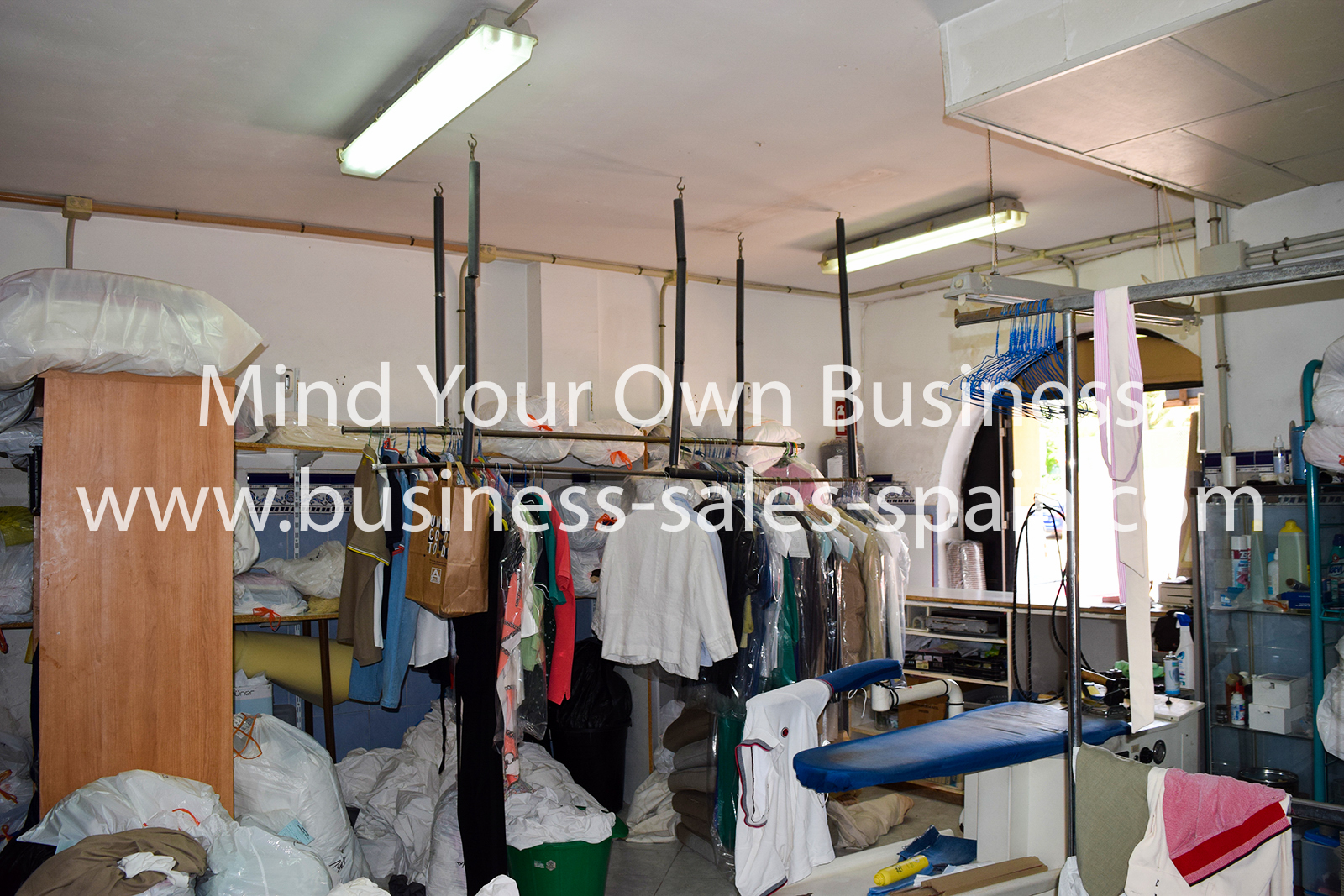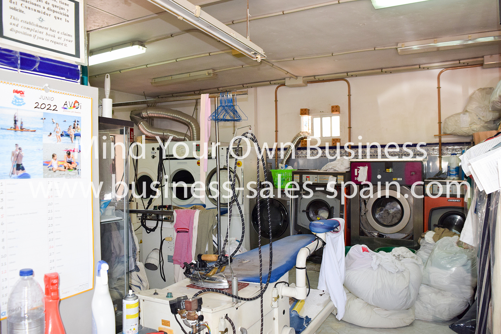 There is a reception desk with cash till, 5 washing machines, 3 dryers and 3 steam ironing stations as well as a folding area. There is also a amount of shelving for bundles of clean laundry and hanging rails for dry cleaning and individual items.