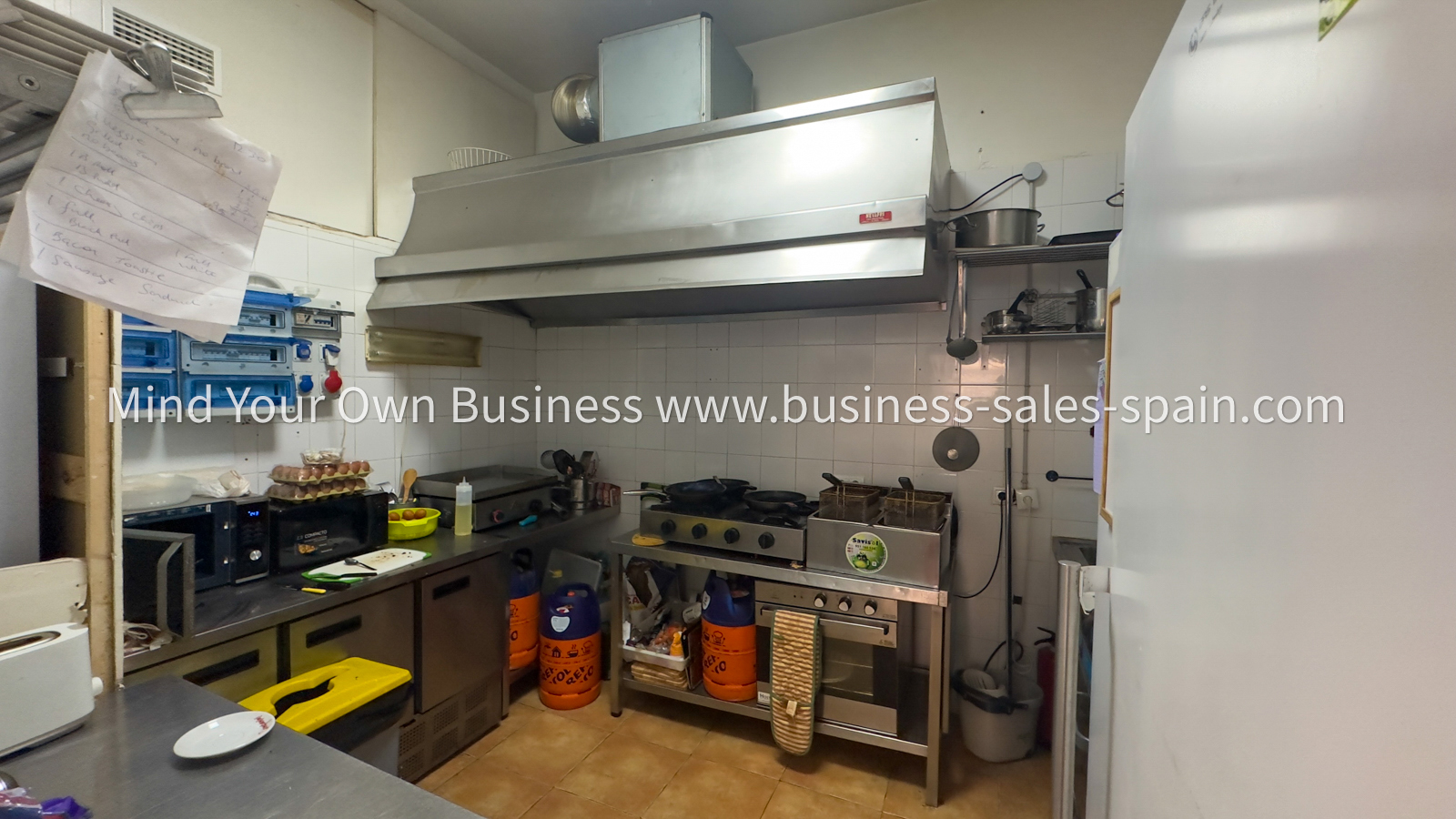 The kitchen is fitted with stainless steel appliances and has a full extraction system. There are two ovens, twin deep fat fryer, plancha (grill) fridges, freezers, sink and shelf space.