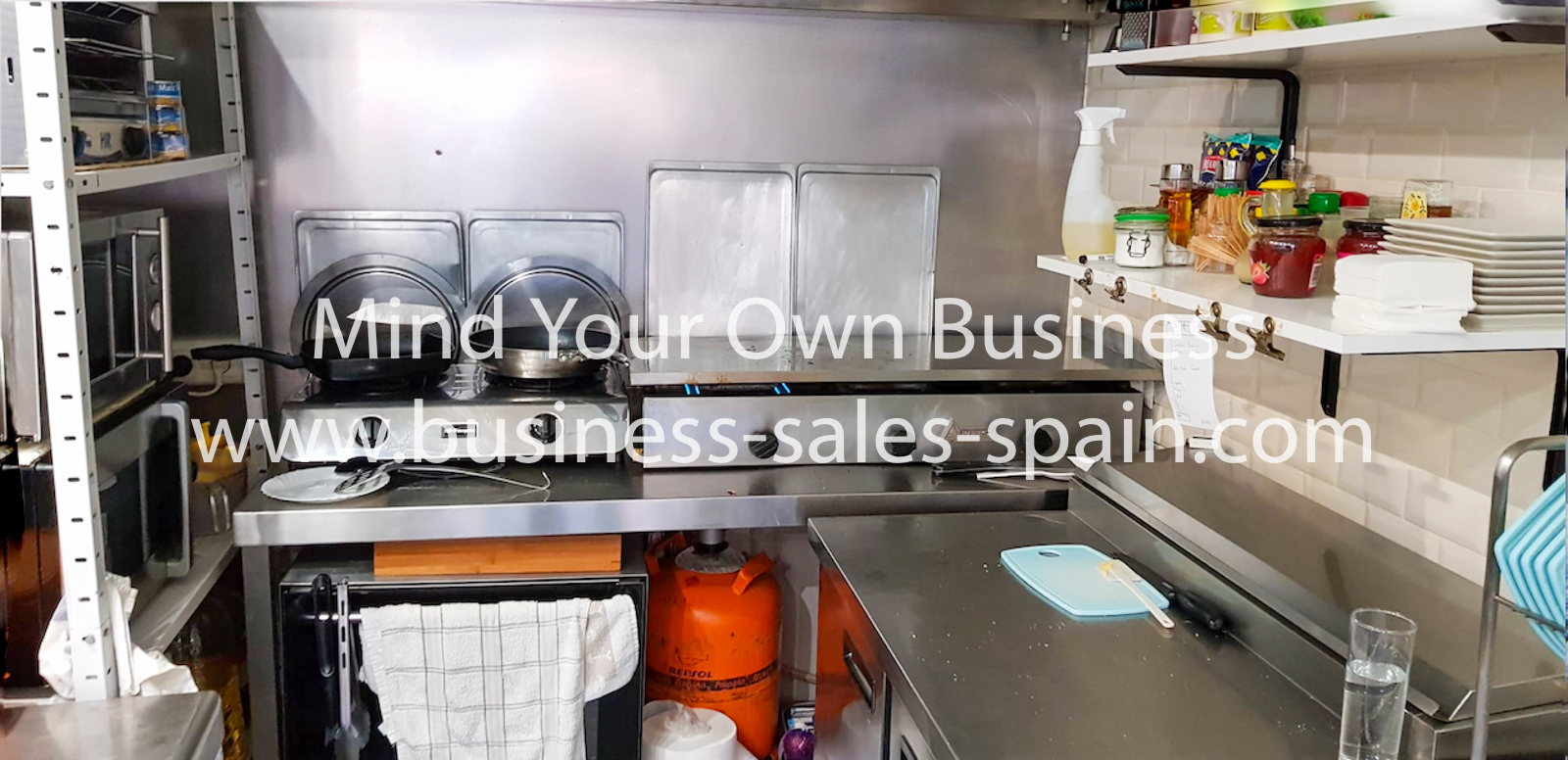 The open kitchen is located to the rear of the bar and has sink, hob, plancha (grill), oven, microwave, a large commercial extractor, fridges, freezers and further preparation space.